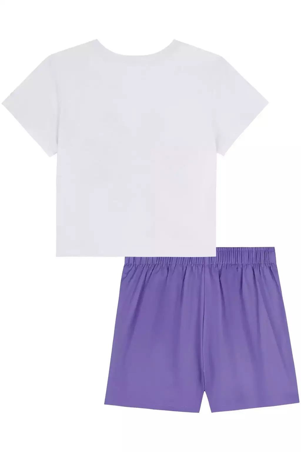 Conjunto de blusa boxy em meia malha possui uma estampa vibrante de flor com a palavra 'ENJOY' ao centro. O shorts lilás em tricoline com elastano possui cós elástico e ajuste interno completa o visual.