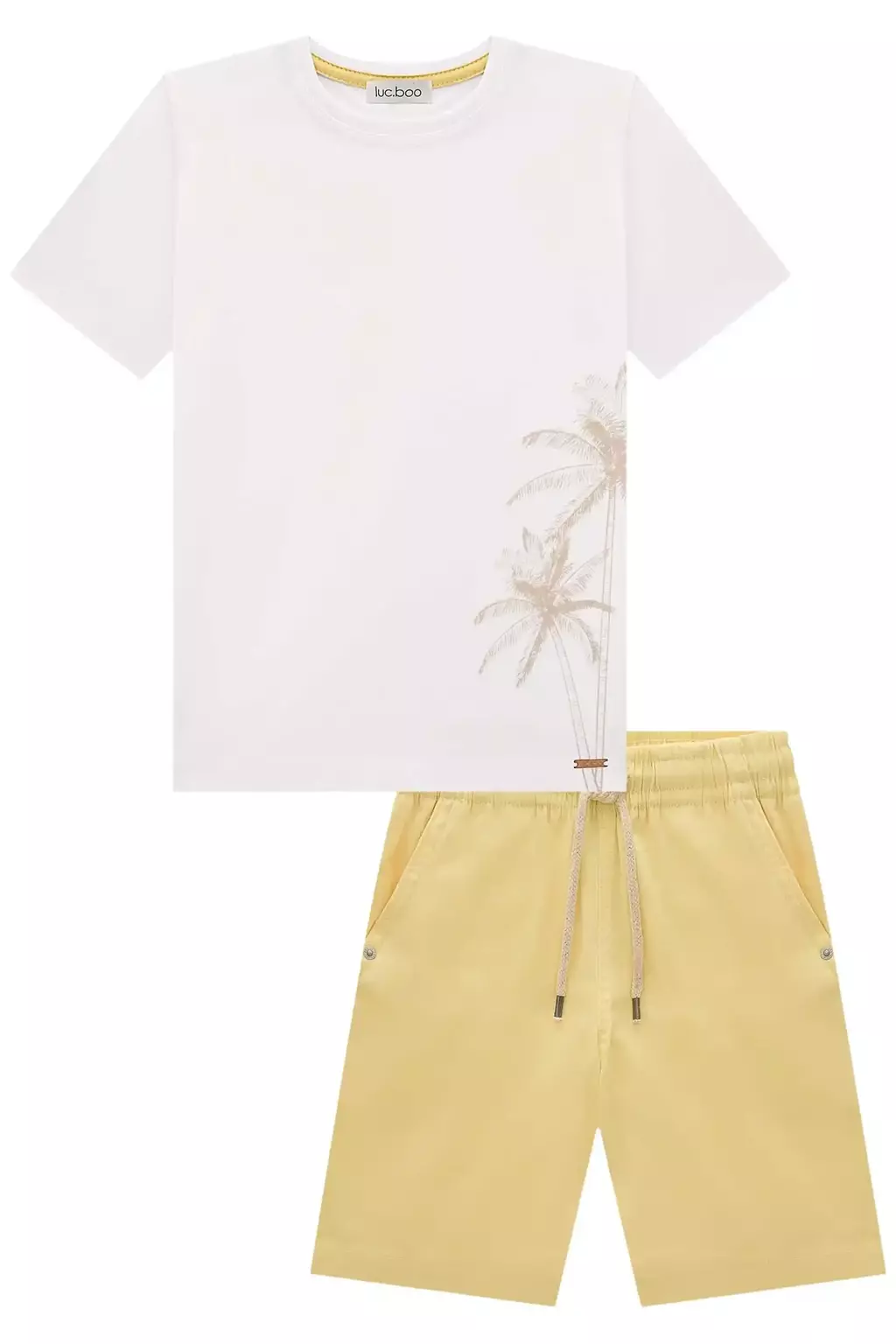 Conjunto de camiseta em meia malha na cor off white e bermuda em linho santorine com elástano na cor amarelo, com cós elástico, cadarço para ajuste e bosos laterais.