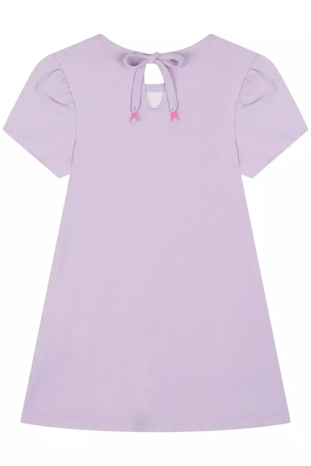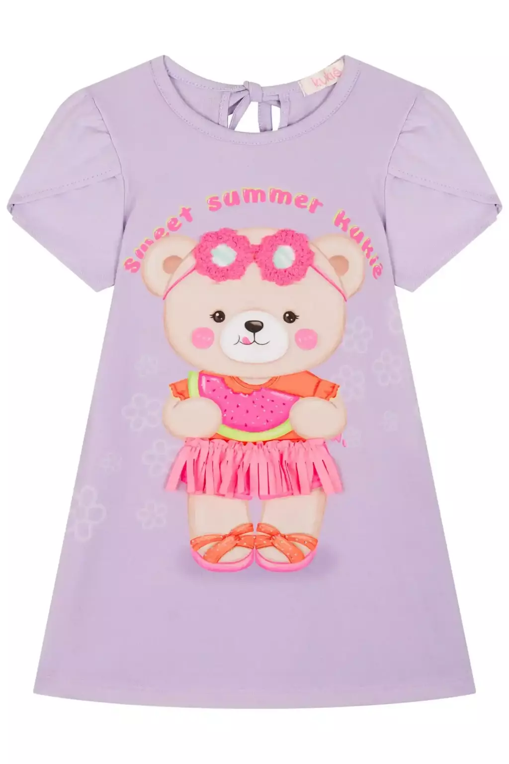 Vestido em cotton com aplicação de pacth de óculos e strass, e babados na saia da ursinha adicionam um charme especial a peça. Com manguinha ultrapassada e cordão de amarração na parte de trás do pescoço para facilitar a troca.